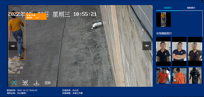工服檢測(cè):對(duì)圖片中未穿工作服的情況做檢測(cè),給出位置信息,如圖是進(jìn)入廠區(qū)后未更換工作服的告警;