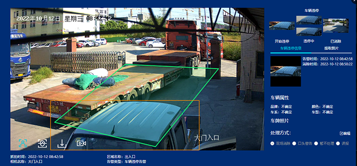 違停檢測(cè):AI智能盒子對(duì)圖片中違反劃線區(qū)域停放車輛的情況做檢測(cè),給出位置信息,如圖是車輛在工廠出入口違停的告警;