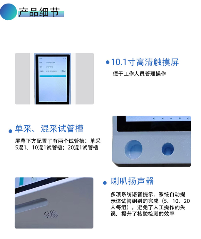核酸碼采集一體機配置有高清攝像或二維碼掃描儀、試管槽、10寸主屏及6寸副屏,擁有音視頻輸出、自助掃碼等功能,實現(xiàn)與核酸系統(tǒng)無縫銜接并實時數(shù)據(jù)同步。支持單采和混采。由醫(yī)護(hù)人員錄入試管條碼后,被采樣人只需要提前打開核酸碼或健康碼,置于機器上方掃碼,僅用4秒即可完成登記,無需專人確認(rèn),自動保存采樣信息,有效提升核酸檢測效能。